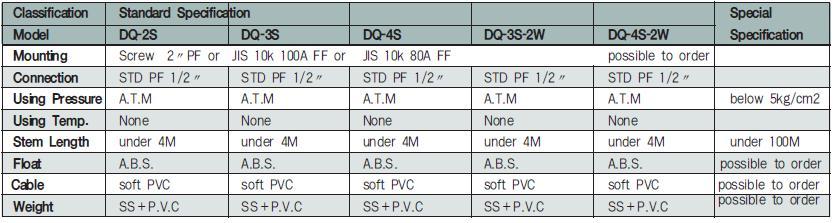 It makes output of on/off signal as the quick float moves up and down in which micro switch or reed switch installed. The on/off signal from the sensor controls supply/drain motor and/or high/low alarm. It is able to make up to 3 motors working together.